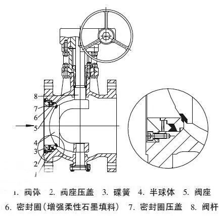 進(jìn)口偏心半球閥密封副的特點(diǎn)是閥門關(guān)閉時(shí),閥座壓蓋壓緊碟簧,由碟簧推動(dòng)密封壓蓋和閥座向半球體壓緊,并使碟簧在設(shè)計(jì)變形范圍內(nèi),使密封副之間的作用力達(dá)到密封必須比壓,真空技術(shù)網(wǎng)認(rèn)為這樣可以保證閥門在低壓時(shí)不發(fā)生內(nèi)漏現(xiàn)象。在閥門啟閉過程中,閥座、密封壓蓋和密封圈作為一個(gè)構(gòu)件隨著半球體開啟角度的變化在管道軸線方向適量懸浮移動(dòng),在介質(zhì)壓力作用下向半球體壓緊,其向閥瓣壓緊的作用力隨著介質(zhì)壓力的升高而增大,從而達(dá)到自密封效果。