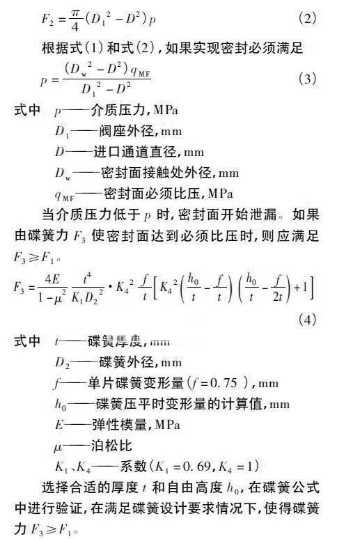 (1) 密封預(yù)緊力。通過螺栓產(chǎn)生一定的預(yù)緊力,再由閥座壓蓋傳遞給碟簧,使得碟簧產(chǎn)生變形。為了延長碟簧使用壽命,碟簧的變形量不能超過自由高度的75%,通過系列力的傳遞使密封副達(dá)到設(shè)計(jì)的密封比壓。